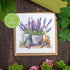 Greetings card with a lavender potting bench picture, printed on flower seed paper. Card is square and approx 14cm in size and comes with a recycled brown kraft paper envelope. The inside is blank for your own message.