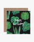 This birthday card features illustrations of aloe vera, monstera deliciosa, fiddle leaf fig, and barrel cactus in a distinctive dark houseplant pattern. It is a unique and thoughtful way to wish someone a happy birthday.